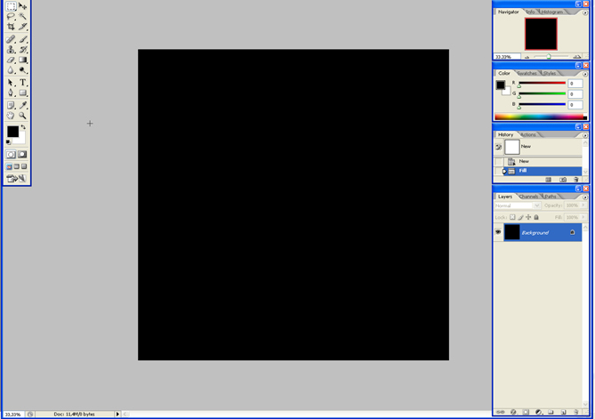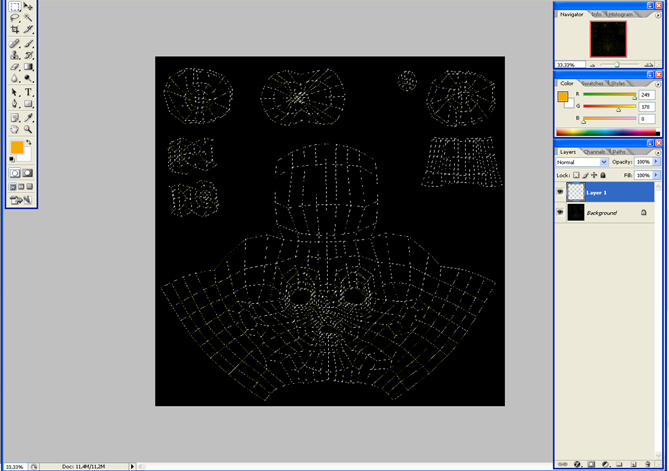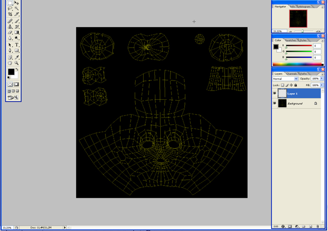 Para que a malha aberta seja transportada para um programa de edição de imagens, é preciso antes que a mesma seja estampada em alguma imagem. O XSI possui, como padrão, uma imagem toda colorida com letras e números. Essa imagem é muito boa para usar como referência para abrir a malha mas, por ser muito colorida, acaba muitas vezes atrapalhando a visualização das linhas da malha. Por isso, aconselha-se que uma imagem seja criada para que depois a malha seja estampada nela. Para tanto, vá até algum programa editor de imagens e crie, por exemplo, uma imagem totalmente na cor preta. No exemplo será usada uma imagem 2000 x 2000 pixels. Importante lembrar que essa imagem pode ser salva no formato JPEG.