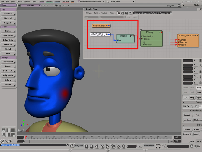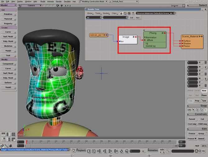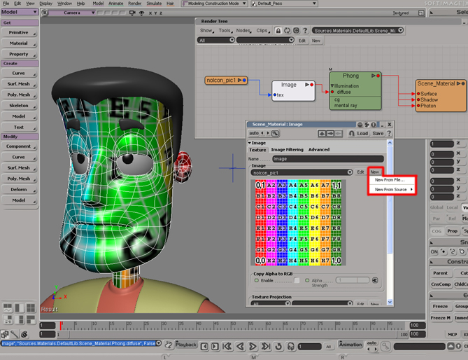 Já no XSI, selecione o objeto que recebeu a textura, abra o Render Tree (atalho “7”), e importe a imagem pelo Nodes / Texture / Image.