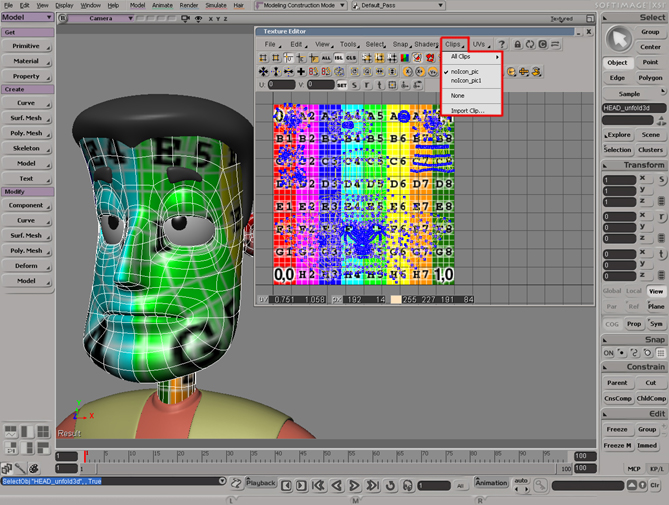 No Texture Editor do XSI (atalho “ALT + 7”), substitua a imagem padrão importando a imagem criada. Para isso, vá em Clips / Import Clip. Nessa opção será possível levar para o software a imagem criada.