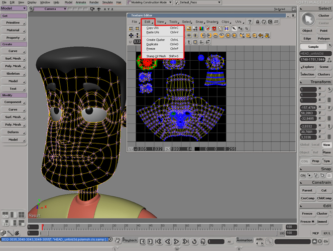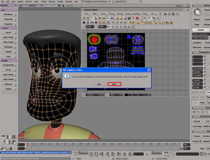 Após importar a imagem para o XSI e posicionar toda a malha dentro da imagem (conforme demonstrado com a malha do rosto do personagem), vá em Edit / Stamp UV Mesh.