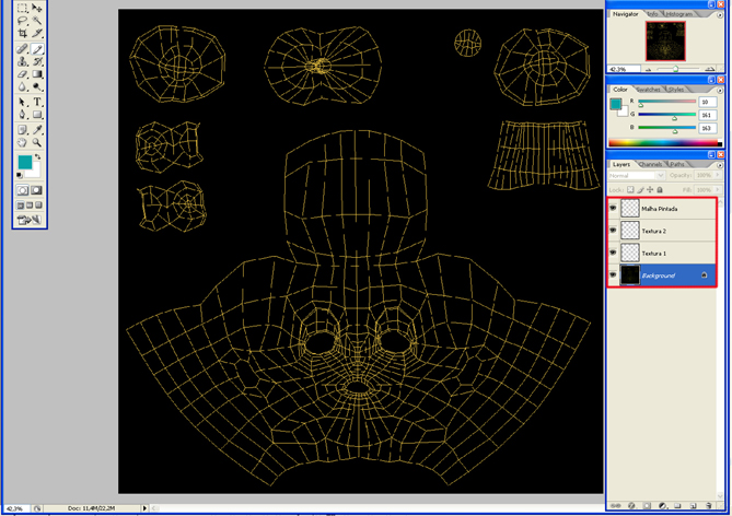Posicione a camada com a malha pintada acima de todas as outras e, agora, crie outras camadas que receberão a textura desejada. Note que todas as camadas criadas deverão estar sempre abaixo da camada com a malha pintada para que, ao texturizar, seja possível ver as linhas da malha aberta. Além disso, é importante que todas as camadas sejam renomeadas para facilitar a organização na texturização.