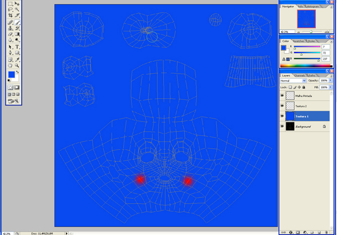 Apósisso, basta criar camadas com texturas até alcançar o resultado desejado. Comoexemplo, será pintado todo o rosto em azul com duas bolas vermelhas posicionadasnas bochechas. Note que, com a malha pintada, é mais fácil saber o que estásendo pintado e, assim, não há o risco de texturizar algo de forma errada.
