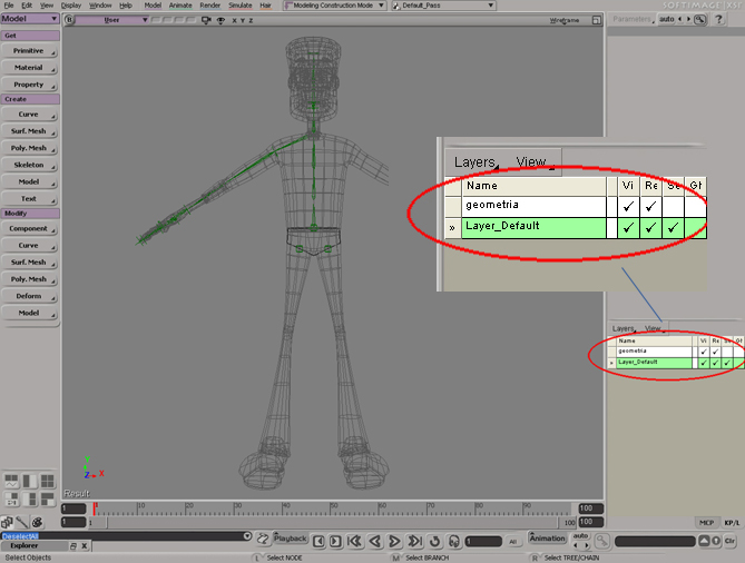 - Selecionar toda a geometria do personagem e separá-la em uma Layer própria. Para tanto, selecione toda geometria, clique em KP/L / Layers / New Layer From Selection. Renomeie a Layer para “Geometria”. Após isso, tire a seletividade dessa Layer e trabalhe na outra com os controladores (é interessante renomeá-la também). Tudo isso serve para facilitar o trabalho com os controladores.