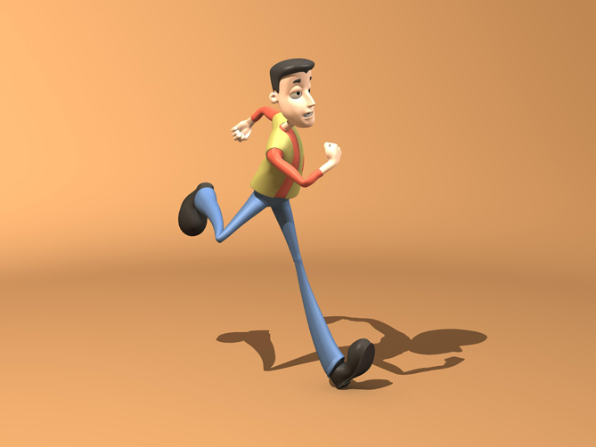 O Run Cycle consiste nos mesmos conceitos que o Walk Cycle. As diferenças se limitam ao timing e ao fato que no Run Cycle o personagem permanece alguns frames fora do chão por completo. Procure referências – veja nos filmes, na Internet ou vá ao parque mais próximo e veja como as pessoas correm. Ou levante-se e procure executar a referência você mesmo!!! Vá até o espelho ou pegue sua câmera e filme-se.