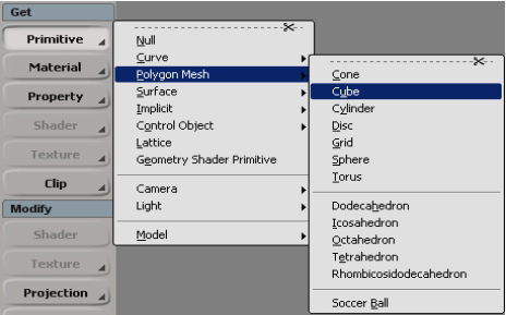 Para começar o trabalho da modelagem, usaremos a técnica “box modeling”. Esse processo consiste em modelar os objetos a partir de um cubo. Para isso faremos Get -> Primitive -> Polygon Mesh -> Cube.