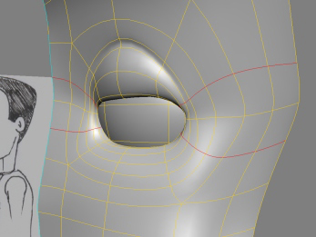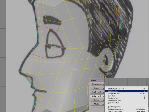 Com a Ferramenta “Modify -> Poly Mesh -> Add Edge Tool” criaremos uma linha que faça o contorno do olho, linha esta que dará origem aos futuros edge loops do olho, que definirão as pálpebras.