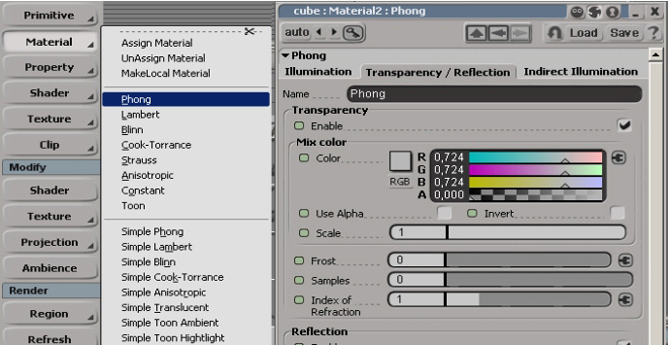 Com o cubo selecionado, daremos a ele um novo material em “Get -> Material ->Phong”. Na janela que se abrirá, na aba “Transparency / Reflection” abaixaremosdentro do mix color da transparência a escala de cores. Com isso o cubo ficarátransparente, possibilitando a visualização da referência atrás dele.