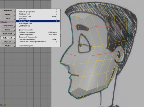 Criaremos agora duas novas linhas que auxiliarão nos volumes da sobrancelha e do nariz. Para isso, em “Modify -> Poly Mesh -> Split Edge Tool” clicaremos no botão do centro do mouse no meio da edge desejada.