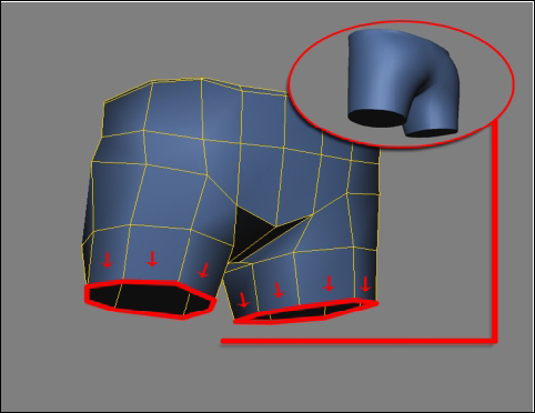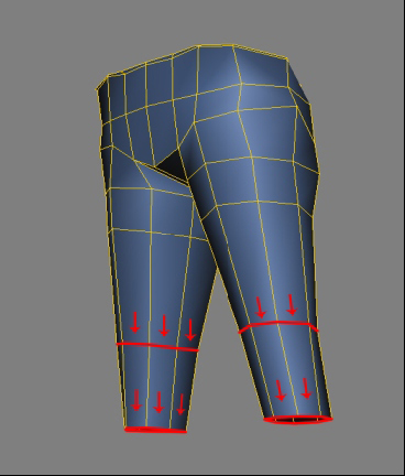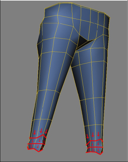 Fazendo agora o extrude marcando o volume interno da calça e outro levando um pouco para dentro.