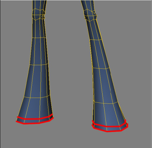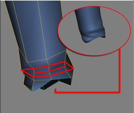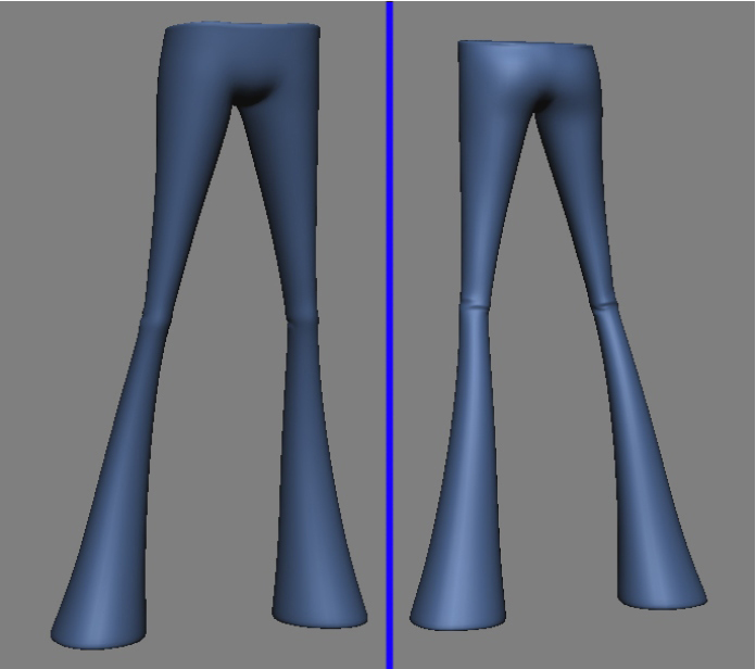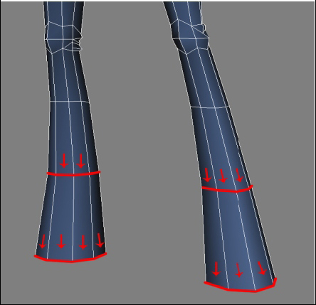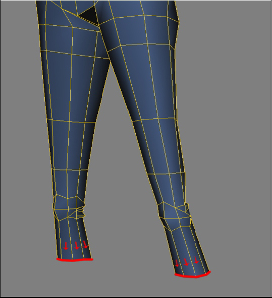 Continuando a criação da perna, agora começando a definir a canela, devemos notar na referência que a calça nessa área não fica grudada na perna; devemos seguir o desenho da “boca de sino”.