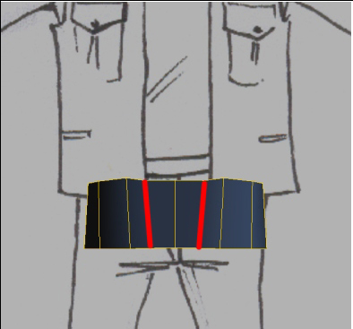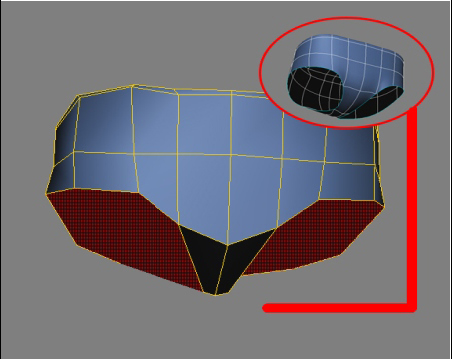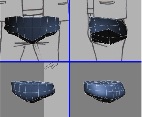 Vamos continuar a modelagem do nosso personagem utilizando agora um Cube de 4X1X2 subdivisões. Posicionaremos ele em cima da cintura do personagem, movendo os vértices e arredondando a geometria.