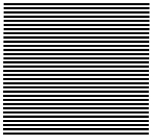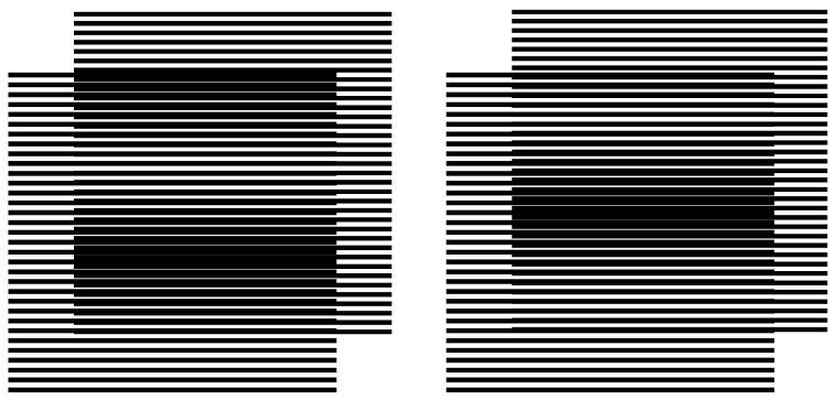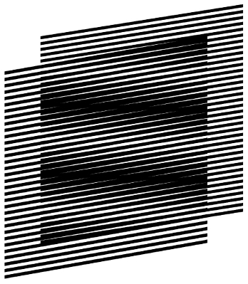 A seguir, desenhamos um segundo conjunto de linhas, idênticas em tudo ao primeiro conjunto. Se sobrepusermos um ao outro, diferentes deslocamentos para cima ou para baixo, mantendo o paralelismo entre os conjuntos de linhas irão mostrar um padrão intermediário de linhas ou mais escuras ou mais claras, de forma uniforme ao longo do desenho, como vemos abaixo: