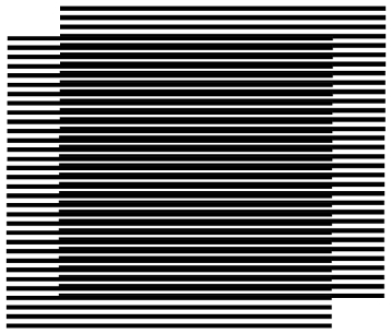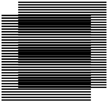 O que faremos agora é alterar ligeiramente o espaçamento entre as linhas de um dos conjuntos, reduzindo a distância entre suas linhas de forma igual para o conjunto todo. Agora, ao fazer a sobreposição e deslocar um dos conjuntos para cima ou para baixo, algo diferente surge: um padrão de repetição de linhas em formato escuro, com aspecto de faixas. São essas faixas o que se denomina moiré, podendo-se ver o resultado da montagem descrita acima na figura a seguir: