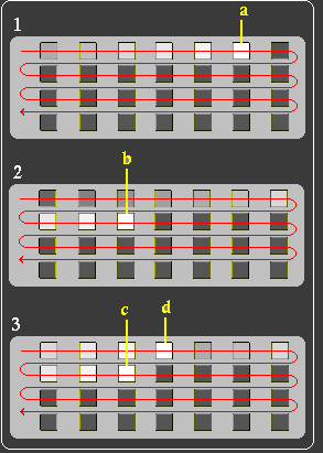 Os pixels à esquerda de "a" continuam recebendo luz e seus acumuladores vão sendo novamente carregados, o que é indicado pela cor dos mesmos, cada vez mais escura. Na imagem "2" o processo de varredura já está mais adiantado, agora é o pixel "b" que acabou de ser lido.