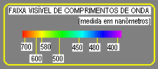 Voltando à faixa visível do espectro, podemos verificar que ela apresenta ainda outra propriedade particular: além de serem visíveis, suas ondas possuem cores diferentes, variando conforme seu comprimento de onda. Assim, as ondas mais "compridas", com 700nm, são avermelhadas. Diminuindo-se gradativamente seu comprimento, passamos pelas alaranjadas (600nm), amarelas (580), verdes (500), ciano (450), azul-escuro (480) e violeta (400), conforme mostra a ilustração abaixo:A resposta é: não há nenhum comprimento de onda correspondente à cor branca, porque ela, individualmente, não existe. O branco, como nós o enxergamos, corresponde à mistura de ondas de todos esses comprimentos, de maneira igualmente distribuída. Basta no entanto desequilibrar essa mistura uniforme, para que a luz resultante deixe de ser branca e adquira outra tonalidade. A luz que chega até a parte superior da atmosfera da Terra, proveniente do Sol, é uma luz equilibrada, contendo iguais porções de todos estes comprimentos de onda da faixa visível do espectro.