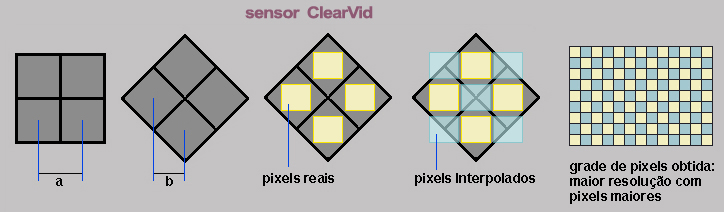 Voltando-se à primeira figura do desenho, é possível ver, em comparação com a quarta figura, como a resolução horizontal (distância entre pixels, maior resolução = menor distância) aumentou nos pixels gerados na área de memória em relação aos pixels existentes no sensor (células cinza) tradicional. O que existe efetivamente no painel CMOS ClearVid são os pixels girados 45 graus, e a partir deles, são gerados na memória os pixels regulares mostrados na última figura do desenho, à direita.