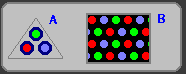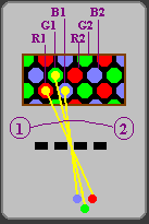 O desenho esquematiza a disposição dos canhões (A) e os pontos (B) de fósforo coloridos, sobre a parte interna do tubo de imagem. Cada conjunto de pontos torna-se luminoso ao ser atingido pelos 3 feixes simultaneamente em sua passagem. Porém cada feixe pode possuir uma intensidade diferente, e a combinação das intensidades das 3 cores forma todas as demais cores quando a imagem é vista à distância: a separação entre os pontos torna-se indistinta. Quanto menores e mais próximos os pontos uns dos outros, maior a resolução da imagem e geralmente o ideal é que um determinado ponto não seja maior do que o pixel a ser representado pelo mesmo.