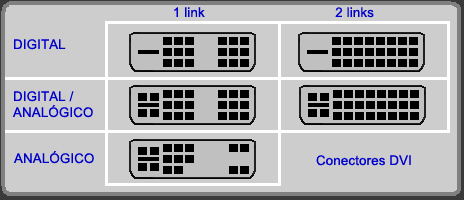 (Digital Visual Interface) conexão para áudio e vídeo em alta definição (HD), do tipo digital sem compressão; assim como a conexão HDMI, é voltada para o segmento consumidor, conectando televisores HD, DVD players, dispositivos com sinaisHDTV e outros, principalmente em home theaters. Proposta em 1999 por um consórcio de empresas (Compaq, Fujitsu, HP, IBM, Intel, Silicon e NEC) denominado Digital Display Working Group (DDWG). A conexão DVI prevê o uso de um ou dois links (conjuntos independentes de fios), o que se reflete em seu conector, que possui espaço para os dois conjuntos de links, mas pode usar somente um deles. Se for necessário o uso de maior largura de banda (bandwidth) para transmissão das informações (como nos formatos HD por exemplo) os dois conjuntos são utilizados. Este esquema foi pensado com a idéia de que o conector DVI pudesse ter utilização a mais abrangente possível, possibilitando seu uso para ligação de aparelhos tanto SD como HD. A abrangência de seu uso é ainda maior ao possibilitar também a transmissão de sinal analógico para monitores de vídeo tradicionais do tipo VGA, o que é feito através de pinos adicionais incluídos no conector. A figura abaixo mostra os 5 tipos possíveis de plugs DVI: