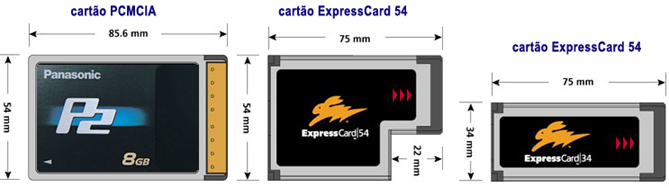 padrão de cartão de memória desenvolvido em 2003 pela associação PCMCIA - Personal Computer Memory Card International Association para substituir, em computação, o antigo padrão PCMCIA (que leva no nome as iniciais da própria associação). O padrão PCMCIA deixa de ser utilizado em computadores, permanecendo seu uso no entanto em outras aplicações, como por exemplo no sistema P2 de memória sólida da Panasonic. O padrão estabelece dois tipos opcionais de conexão para o cartão, USB 2.0 e PCI Express . Na conexão USB 2.0 a velocidade máxima de transferência de dados é de 400Mbits/seg. e na conexão PCI Express, a velocidade máxima é 2,5Gbits/seg. Os cartões ExpressCard podem ter 2 tipos de tamanho: com 34mm de largura (ExpressCard/34) e com 54mm de largura (ExpressCard/54). O conector do cartão maior no entanto tem o mesmo tamanho do menor (34mm), pois o formato do cartão é em "L". O tipo menor é utilizado no formato XDCAM EX da Sony. A figura abaixo mostra os dois tipos de cartões ExpressCardjuntamente com um cartão PCMCIA tradicional: