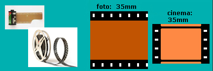 A fotografia possui também outra grande variedade de tamanhos e formatos e, da mesma forma, existe o formato dominante da era pré-digital, de bitola 35mm. Trata-se da mesma película utilizada no cinema, porém, em fotografia, desloca-se no sentido horizontal ao invés do sentido vertical presente na maioria dos equipamentos de cinema, como mostra a figura abaixo: