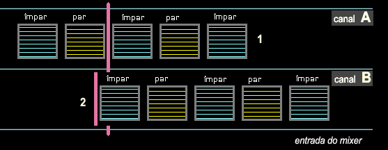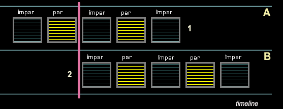 O "casamento" dos tempos dos sinais referido aqui nada tem a ver com o Timecode (utilizado ou não) e sim com o momento em que tem início o desenho de cada linha em cada quadro de cada conteúdo de vídeo combinado na timeline, como exemplifica o desenho abaixo, onde aparecem os campos par e ímpar (cujo conjunto forma um quadro), na sequência, um após o outro: