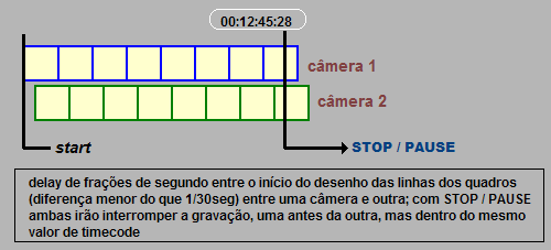 O esquema mostra uma interrupção simultânea na gravação das 2 câmeras (feita através de um controle remoto unificado): apesar do timecode ser idêntico neste momento para ambas, uma delas está mais adiantada no desenho dos quadros do sinal de imagem. O corte ao vivo do sinal de uma delas para o sinal da outra, via um mixer sem compensação de buffer de memória como mostrado anteriormente, causará instabilidade no sinal.