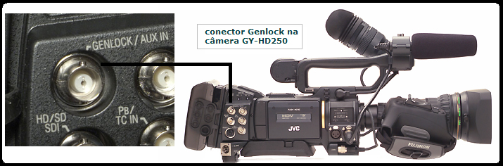 A imagem abaixo mostra uma entrada do tipo genlock na câmera GY-HD250U da JVC. Geralmente câmeras comercializadas para uso em estúdio (ou em versão estúdio, quando mais de uma versão do mesmo equipamento está disponível) possuem o conector para genlock, como mostra a imagem abaixo:
