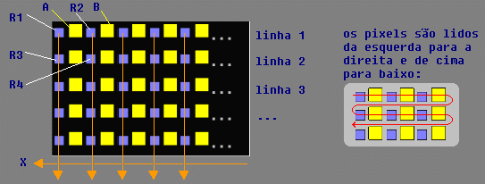 o CCD é composto por uma grade de pixels e, ao lado de cada um deles existe, no chip onde reside o CCD, um acumulador de carga elétrica denominado registrador. No desenho abaixo, os quadrados amarelos representam os pixels e os azuis os registradores: