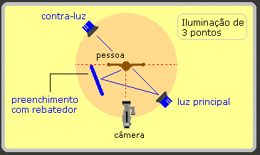 A luz de preenchimento é colocada em nível mais baixo do que o da luz principal, normalmente formando um ângulo de 30 graus em relação à câmera e o rosto da pessoa, como mostra a figura abaixo: