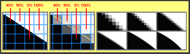 O desenho mostra que os pixels recebem luz em diferentes proporções em sua superfície com 4 exemplos de pixels, um que recebe luz em 40% de sua superfície, outro que recebe luz em 90% de sua superfície, outro que não recebe nenhuma luz e um último que recebe 100% de luz. Como o pixel é uma célula fotoelétrica em miniatura, cada um desses pixels mencionados vai gerar energia elétrica, com exceção do localizado na parte escura da imagem. E de acordo com a intensidade luminosa que recebe, cada pixel gerará uma intensidade diferente de energia elétrica. Cada pixel possui um acumulador de energia associado ao mesmo. Assim, com o passar do tempo (milisegundos) a energia gerada em cada um deles vai sendo armazenada individualmente. Esses acumuladores são a seguir lidos pelo circuito eletrônico gerando um sinal elétrico de intensidade variável (conforme a carga acumulada para cada pixel) que, após sofrer algumas transformações e ajustes é armazenado em uma fita ou disco. No momento de reproduzir a imagem, a informação armazenada para cada pixel é recuperada. Para um dos pixels da borda do círculo por exemplo, será "área com 40% de luminosidade", o que fará com que a área correspondente ao mesmo na tela do monitor fique cinza, como mostra o segundo desenho. A conclusão: perdeu-se o detalhe da curvatura do círculo.