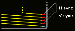 quando o sinal que resultará no desenho das linhas na tela é enviado ao CRT, é preciso informar ao mesmo onde começa e termina cada linha. Isto porque o sinal é linear, do tipo "aaaaabbbbb..." , onde "aaaaa" representa uma das linhas e "bbbbb" a linha seguinte. É necessário informar ao canhão que emite o feixe de elétrons que determinada linha acabou e tem que ser efetuado o retrace horizontal para que a linha seguinte seja desenhada. Desta forma o sinal é acrescido de uma instrução especial tornando-se do tipo "aaaaaHbbbbbH...", onde "H" representa a indicação de término da linha, chamada pulso horizontal de sincronismo (horizontal pulse sync ou H-sync). Quando o desenho de todas as linhas horizontais de determinado campo termina, é necessário informar ao canhão que deve ser efetuado o retrace vertical para o desenho do campo seguinte. Assim, representando por "V" o pulso vertical de sincronismo (vertical sync pulse ou V-sync) o sinal de vídeo teria a seguinte configuração: