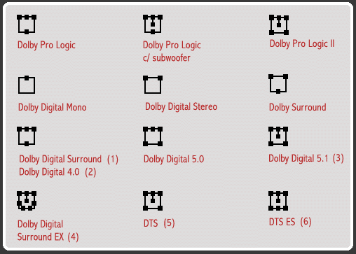 Estes símbolos estão geralmente presentes nas mídias comercializadas, como capas de DVD-Video por exemplo. O desenho abaixo mostra o direcionamento do canal no sistema de 6 caixas: