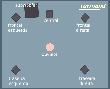 O esquema mais comum, principalmente em home theaters, emprega 6 caixas de som, 3 delas localizadas à frente do ouvinte: uma à sua esquerda, outra à sua direita e a terceira na posição intermediária (central) entre as duas (left, center, right). Duas outras caixas são colocadas atrás do ouvinte, uma à esquerda e outra à direita (left rear, right rear). E a sexta caixa não tem posição determinada: especializada em reproduzir sons graves, sua localização em relação ao ouvinte não é tão importante, pois o ouvido humano é muito pouco sensível à identificação do local de origem de sons graves do que de sons de outras frequências, como os médios e agudos. Geralmente 5 das 6 caixas tem construção idêntica: de tamanho normalmente pequeno, são especializadas na reprodução dos sons médios e agudos. A caixa que reproduz os sons graves é bem maior e mais pesada; com aspecto de um cubo, é conhecida como subwoofer. A figura abaixo ilustra uma disposição típica para essas caixas: