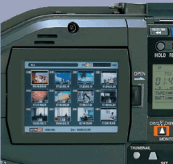 imagem em tamanho reduzido (o nome deriva da representação de uma imagem na tela do computador que teria as dimensões aproximadas da unha (nail) de um polegar (thumb) de um adulto). Para facilitar a busca e identificação de trechos de gravações em vídeo, é comum a representação dos mesmos através de thumbnails. Assim por exemplo, em câmeras de vídeo que utilizam esse recurso, a cada vez que o botão REC é pressionado uma imagem em tamanho reduzido (thumbnail) dos primeiros quadros registrados é gerada. Após várias sequências gravadas, sua identificação é facilitada através da visão de um conjunto de thumbnails agrupados, vistos na tela do LCD . Através de um cursor ou do toque direto na tela (no caso de tela toutch screen) seleciona-se, através do thumbnail correspondente, o vídeo gravado desejado, que pode então ser reproduzido, ter suas propriedades alteradas, etc... Abaixo, o visor LCD da câmera Panasonic AG-HPX2000 mostrando a visão dos thumbnails dos trechos gravados: