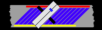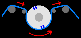 O desenho seguinte, abaixo, mostra o conjunto visto de cima e como a fita é envolvida na superfície do cilindro das cabeças. A presença das duas cabeças garante que uma delas esteja sempre em contato com a fita. O desenho mostra essas duas cabeças opostas no cilindro e a indicação do percurso da fita / sentido de rotação do cilindro (no desenho não aparece a inclinação do cilindro, por ser uma vista superior):