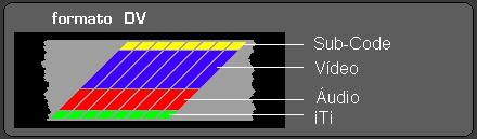 O desenho abaixo esquematiza a disposição das trilhas de imagem e som na fita DV: