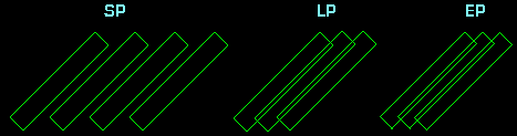 Outro fator que influencia a disposição e dimensão (largura) das trilhas é a velocidade de deslocamento da fita. Esta situação, que aplica-se somente aos VCRs do segmento consumidor / semi-profissional faz com que, quanto menor a velocidade da fita, mais próximas as trilhas fiquem umas das outras e mais estreitas elas sejam. Assim, enquanto que para esse tipo de equipamento a largura de cada trilha é de 0,040mm no modo SP, passa a ser de 0,030mm no modo LP e 0,020mm no modo EP. Nos modos LP / EP também passa a ocorrer sobreposição das mesmas, 0,01mm nos dois casos. Trilhas mais estreitas armazenam menos informação, acarretando imagem ruim. E a sobreposição, ao contrário do que ocorre nos equipamentos profissionais, onde é uma "sobra", aqui faz com que qualquer imprecisão no deslocamento fita-cabeça cause distúrbios na imagem. O desenho abaixo ilustra a disposição e tamanho das trilhas nos 3 modos de gravação:
