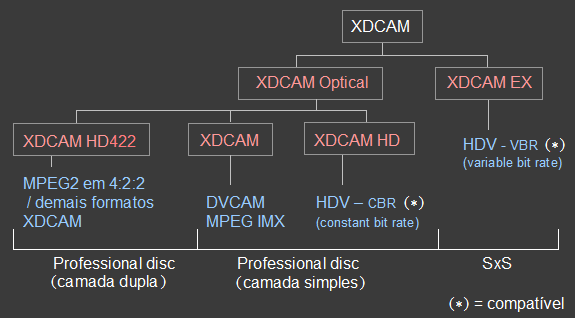 não é propriamente um formato e sim um sistema de armazenamento de dados de vídeo digital, criado pela Sony em 2004. Utilizado no segmento profissional, emprega câmeras e VCR.s gravando dados de imagem em discos ópticos semelhantes aos discos Blu-ray , chamados Professional Disc e também em cartões de memória do tipo ExpressCard. No primeiro caso o sistemaé denominado XDCAM Optical, e no segundo,XDCAM EX. Osistema XDCAM Optical por sua vez divide-se ainda em 3 outros sistemas: XDCAM, XDCAM HD e XDCAM HD422. Estes sistemas permitem a escolha, via menu da câmera, do tipo de sinal a ser gravado: formatos DVCAM ou MPEG IMX (no XDCAM),um sinal compatível com HDV em CBR (taxa de bit rate constante, no XDCAM HD) euma variante do sinal HDV, no caso utilizando MPEG2 com chroma subsampling 4:2:2 (no XDCAM HD422). O XDCAM HD422 grava seus sinais em um Professional disc decamada dupla, ao invés de camada simples como é o caso do XDCAM e XDCAM HD.Enquanto o bit rate utilizado no XDCAM HD é de 25Mbits/seg., no XDCAM HD422 ovolume de informações é o dobro, com 50Mbits/seg. O sistema XDCAM EX utilizasinal compatível com o formato HDV, gravado em VBR (taxa de bit rate variável).Comum a todos esses sistemas está a gravação de arquivos do tipometadata MXF (metadata) eproxy stream. O quadro abaixo mostras asdiversas opções do sistema XDCAM: